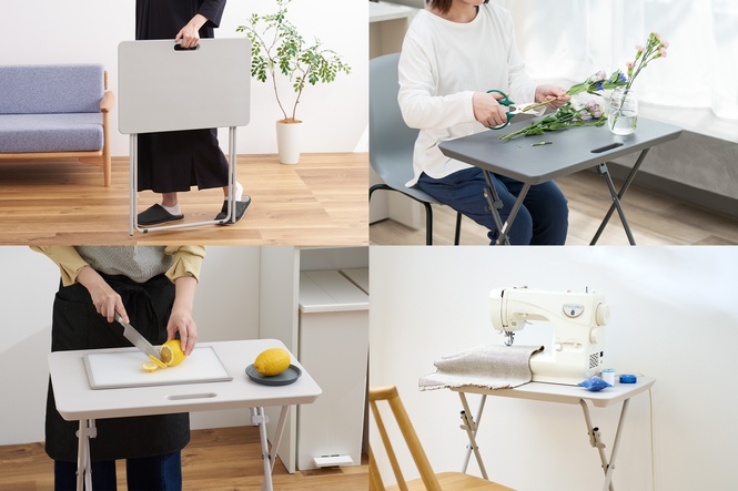 「家の中でどんなときに作業スペースが欲しくなるのか」を市場の声をもとに分析したところ、狭いキッチンでの調理、ミシン作業、子どものお絵かきや工作、観葉植物のお手入れなど、ダイニングテーブルでは汚れやキズが気になるシーンが多いことが分かりました。 そこでKEYUCAでは【必要なときに、必要な場所に、楽に運べてサッと使える】をテーマに、軽量で持ち運びやすく、お手入れしやすい設計の折りたたみデスクを開発。ハンドル付きで女性でも運びやすく、折りたたむと厚さわずか3.5cmでスリムに収納可能。必要なときにサッと広げて使える便利さが魅力の商品です。 今回、お客様から寄せられた「部屋になじむ優しい色がほしい」という声を受け、インテリアに溶け込みやすい新カラーとしてリニューアル。暮らしの幅広いシーンに寄り添い、より快適な時間をお届けします。