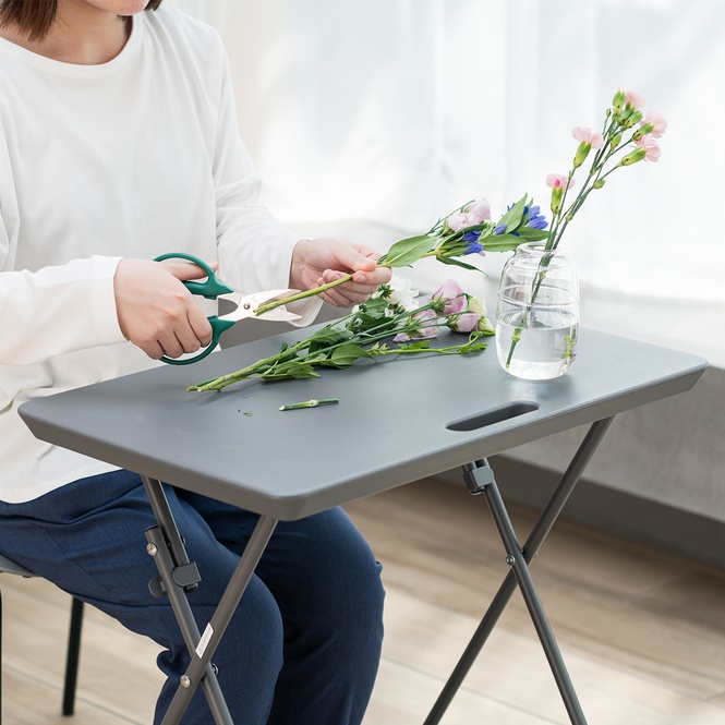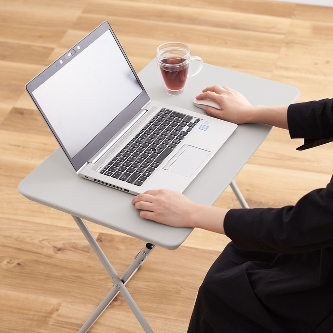 天板の大きさは63×40cmで、ノートパソコン、マウス、ドリンクなどを置いても十分余裕があり、お家のなかでの様々な作業で使いやすいサイズ感になっています。 また、樹脂製の天板は汚れに強く、さっと拭くだけで清潔に保てます。