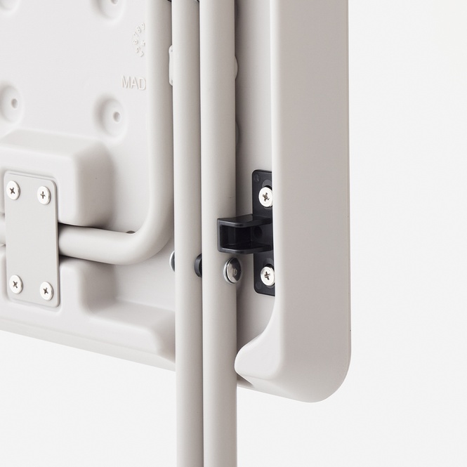 折りたたむと厚みが3.5cmとスリムなので、狭い隙間でもスッキリと収納できます。 また、閉じたときに脚のパイプが出っ張らず、天板の厚み内に収まるので、出し入れの際に引っかかりません。ロック部品付きで立てかけた際などに脚が開いて転倒する事を防ぎます。