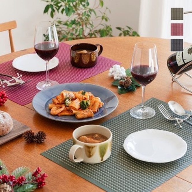 落ち着いたカラーと金色・銀色のステッチの組み合わせが華やかなランチョンマットです。パーティーのコーディネートにも、普段の食卓にも、上品に特別感をプラスします。レッドは数量限定発売です。 商品概要