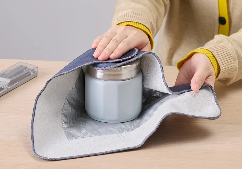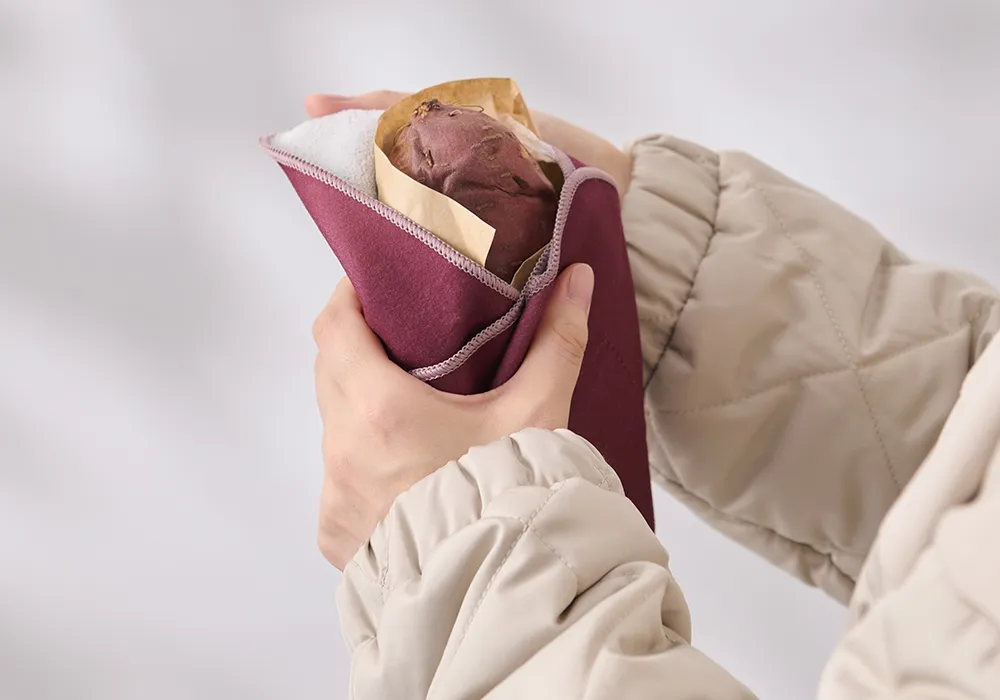 使い方はとっても簡単。“くるっと巻くだけ”で、持ち運びラクラク。これからの季節はスープジャーや、焼き芋にも!オフィスでもお出かけでも、1年中頼れる便利アイテムです。