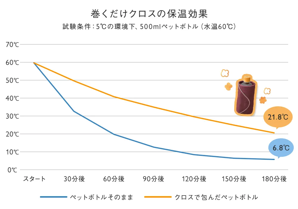 あたたかいペットボトルにクロスを巻いたものと、そのまま放置したものを比べると、時間が経っても温かさの違いは歴然。温かいペットボトル飲料や缶飲料も、長く楽しめます。