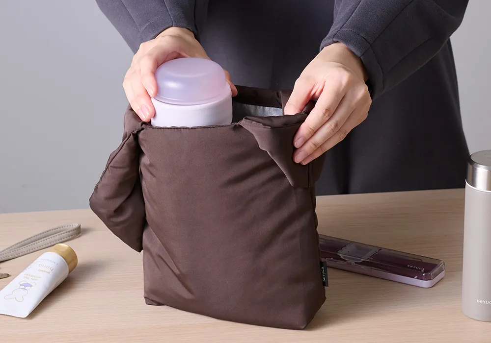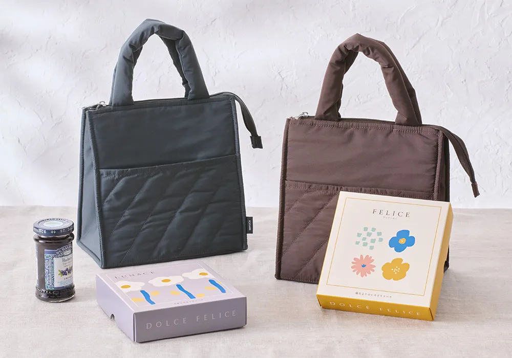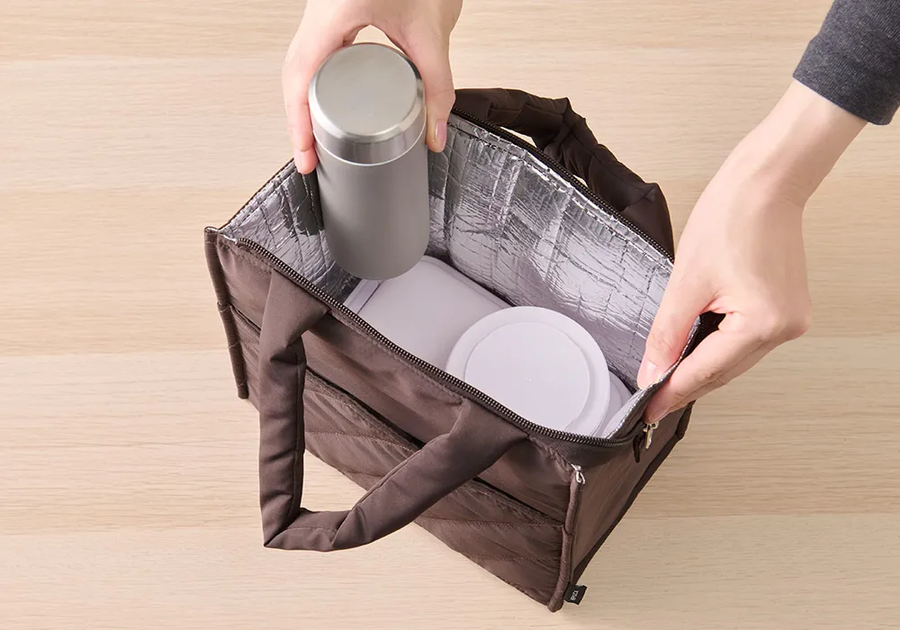 バッグ全体に中綿を入れることで、中身をふわっと包む緩衝材の役割も。コンパクトで持ち歩きやすいサイズ感とふっくらとしたフォルムで高級感やあったか感も演出。縦型お弁当箱やジャー類がすっきり収まり、これからの季節にぴったりです。