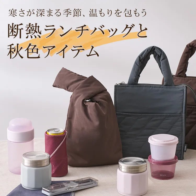 シンプルで機能的なデザインに加え、落ち着いたトーンのカラーリングで、これからの季節にぴったりのラインアップ。巻くだけで温度キープできるクロスから、持ち運びに便利な中綿入りバッグ、大容量のトートまで、シーンに合わせて選べる充実の展開です。オフィスやお散歩、ちょっとしたお出かけにもぴったり。ケユカのランチグッズで、秋冬のランチタイムをよりあたたかく、より快適に。