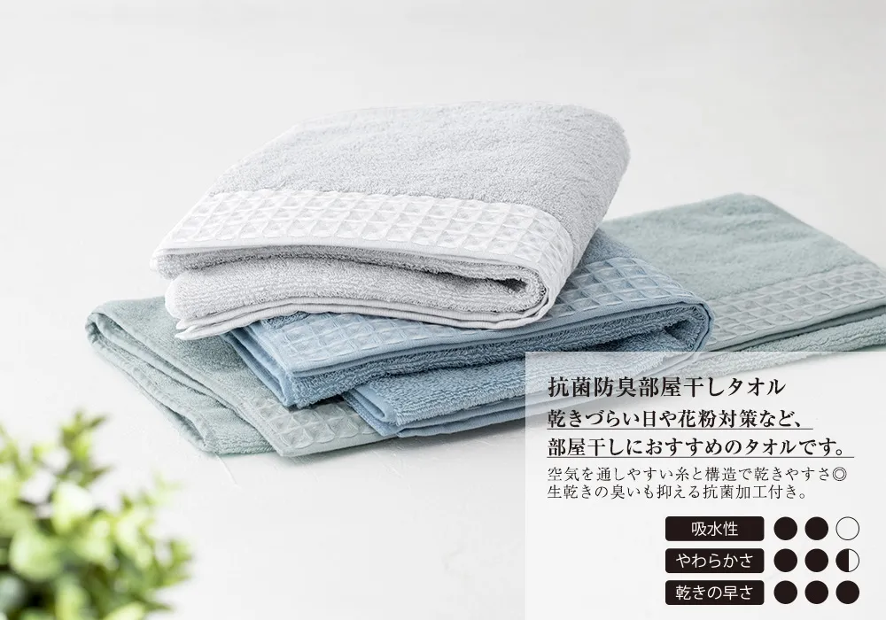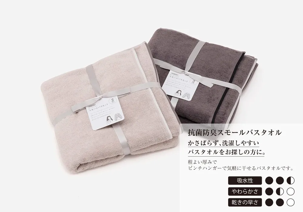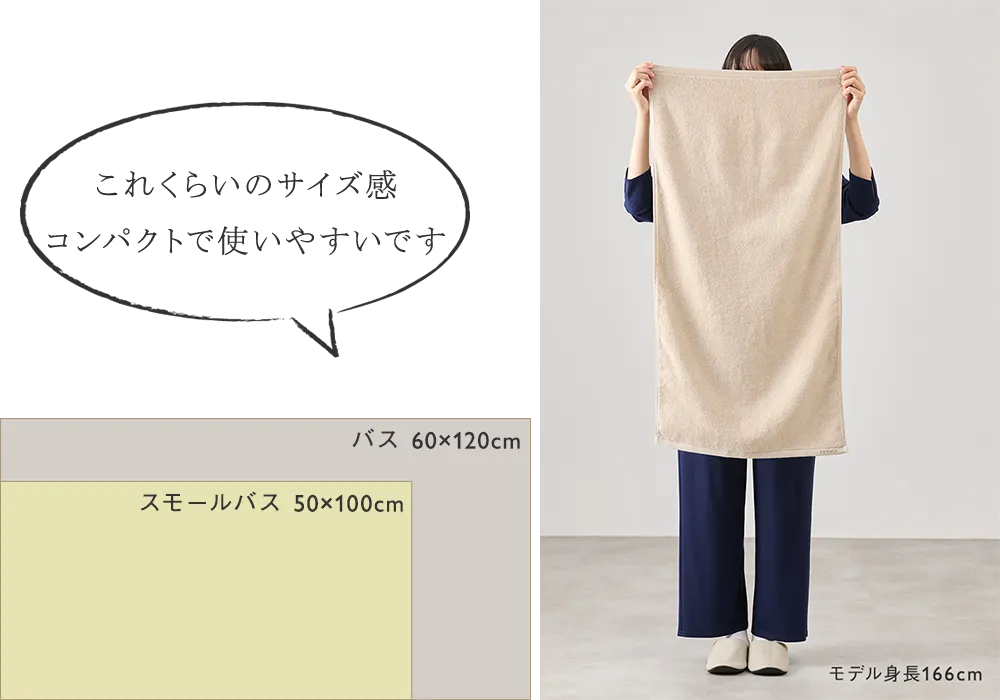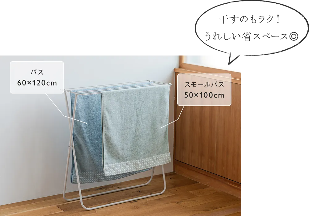 バスタオルだと大きすぎて、使っていない部分があるように感じていたが、スモールバスタオルならムダがなく快適に使える。洗濯時に干す場所を選ばず、長さが短いので、少し低めのバーでも床につかずに干せるのが便利。