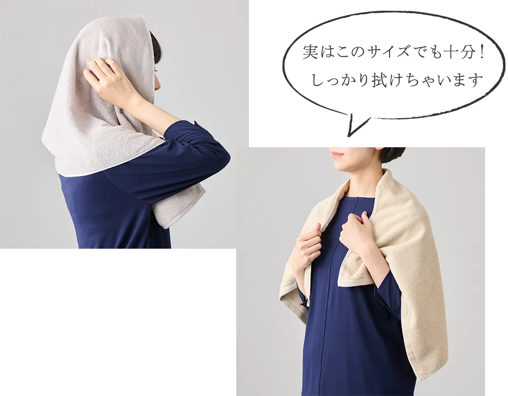 洗濯や収納でかさばらないサイズと厚みです。頭を拭くとき大きくて厚いと扱いづらいですが、このサイズだと軽くて取り回しがいいです。このサイズを使ったらバスタオルには戻れなくなりました!