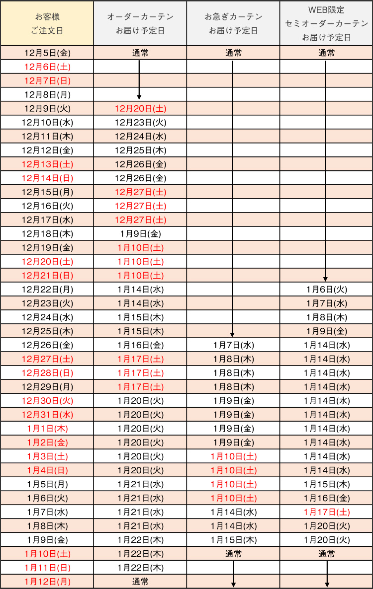 オーダーカーテン・お急ぎカーテン・WEB限定セミオーダーカーテンのご注文は年末年始の休業に伴い、お届けまでの日数が変更となっております。