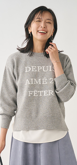 重くになりがちなニットのコーデをキャッチーなロゴニットでカジュアルになりすぎず、バランスよく着こなせます。ジャケットを羽織ったときもシンプルになりすぎず、オシャレ見え。