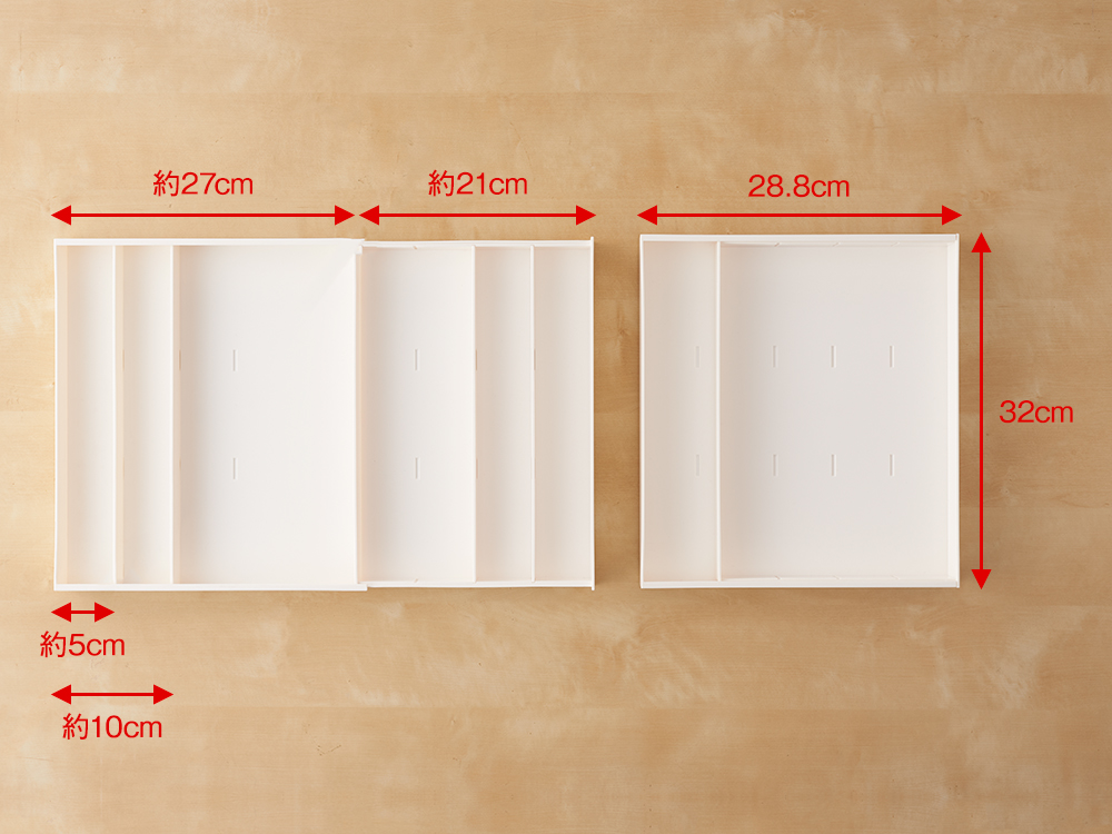 BOXシリーズより高さが低いので、より浅い引き出しにおすすめです。伸縮するので、引き出しのサイズにぴったり合わせて有効的に収納することができます。固定の3仕切りのスペースはカトラリーや箸にちょうど良いです。 サイズ:幅21×奥行き32~50×高さ3cm
