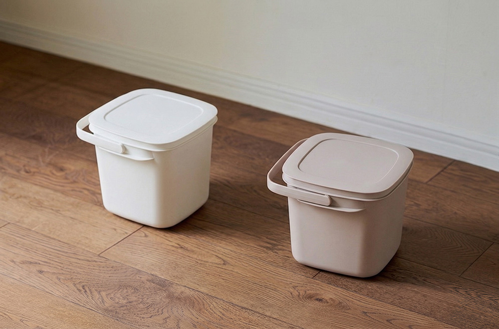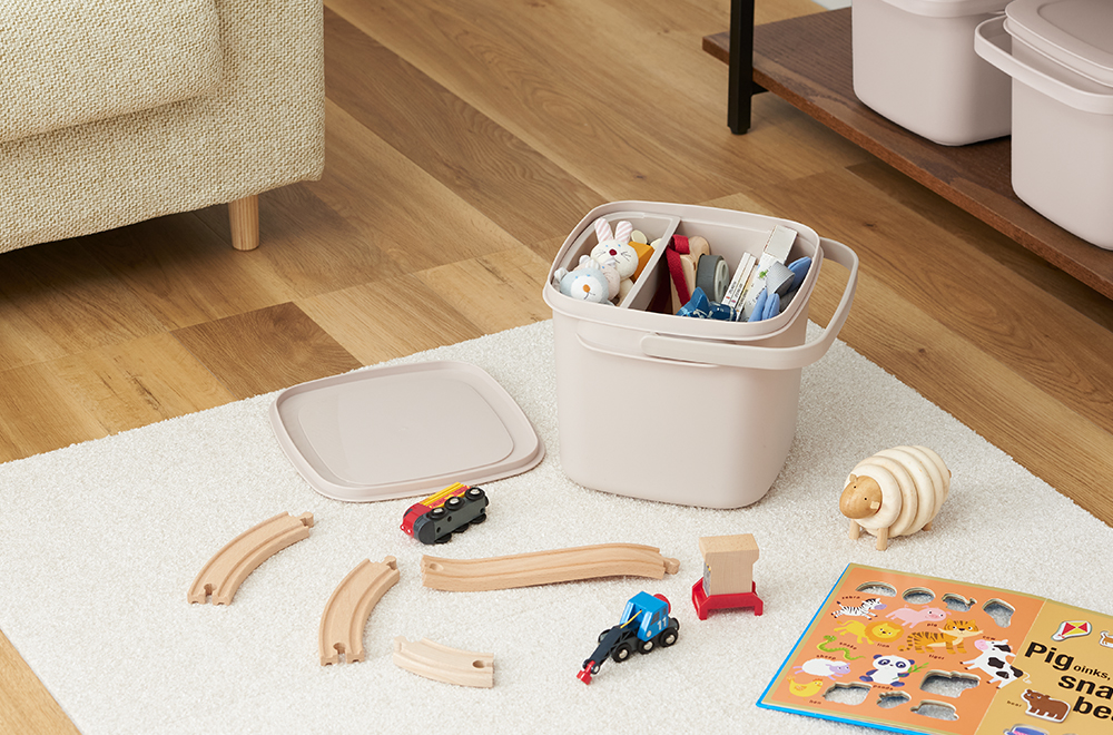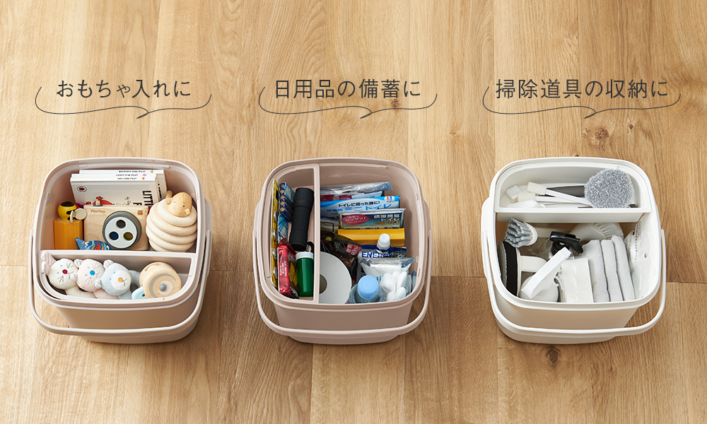 迷子になってしまいがちな小さいものは、取外し可能な小物ケースに。バケツの底を掘り起こすこともなくなり、パッと必要なものを取り出せます。